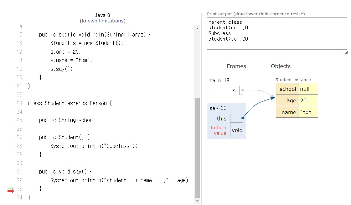- age, name 멤버변수는 부모클래스로부터 상속받은 변수이므로, s.age=20;, s.name="tom"; 이 두 구문은 서브클래스안의 부모 객체에 저장됩니다. 참조변수 s는 힙 영역 안의 서브클래스 객체를 찾기위해 참조를 보유합니다. 그런다음 name, age를 할당한다.
